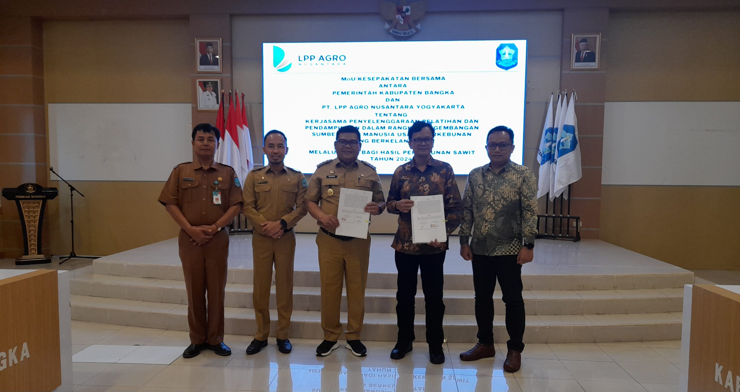 Sungailiat – Pj Bupati Bangka M. Haris AR, AP, M.H Mewakili Pemerintah Kabupaten Bangka bersama Direktur PT LPP Agro Nusantara Yogyakarta, Pranoto Hadi Raharjo S.T., M.M., melaksanakan Penandatanganan MoU, di Ruang Pertemuan Parai Tenggiri, Senin (09/09/2024.