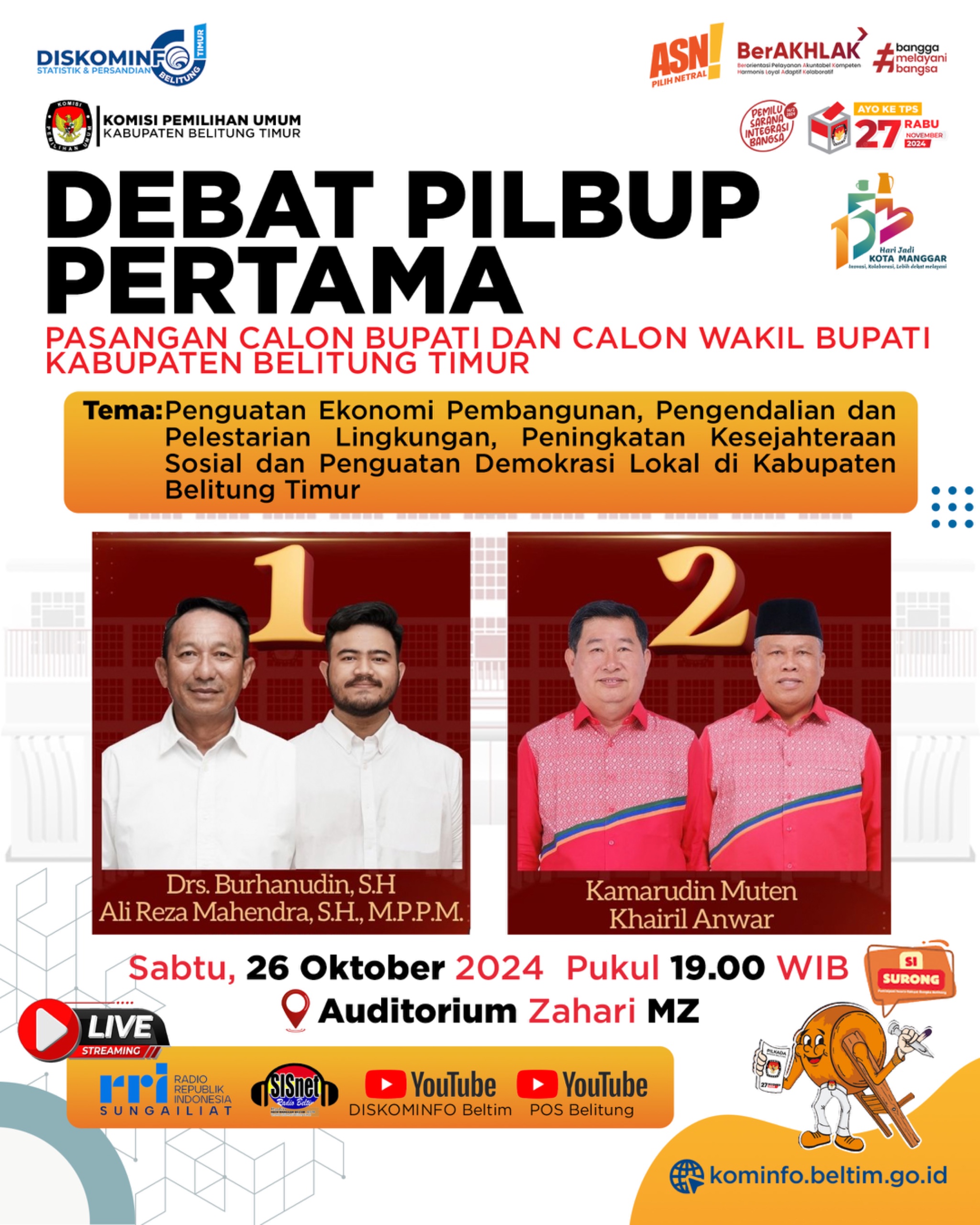 Debat cabup dan cawabup yang berlangsung pada 26 Oktober 2024 di Auditorium Sahari MZ, Kompleks pPerkantoran Terpadu Pemkab Belitung Timur ini akan menyajikan visi, misi, serta program kerja dari masing-masing pasangan calon, guna memberikan informasi yang komprehensif kepada masyarakat.