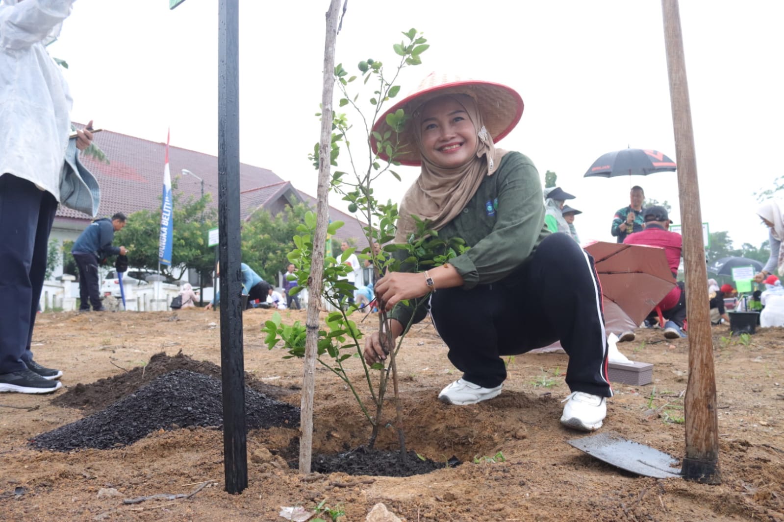 Di tengah hujan gerimis, aneka pohon bibit buah telah terjejer rapi untuk langsung dimasukkan ke lubang tanam. Tampak Pj Ketua TP PKK Dya Sugito sekaligus selaku Penasihat Dharma Wanita Persatuan (DWP) Provinsi Kepulauan Bangka Belitung sigap menanam pohon jeruk kunci dihadapannya bersama dengan Plh Ketua DWP Kep. Babel Sri Hidayati Fery Afrianto.