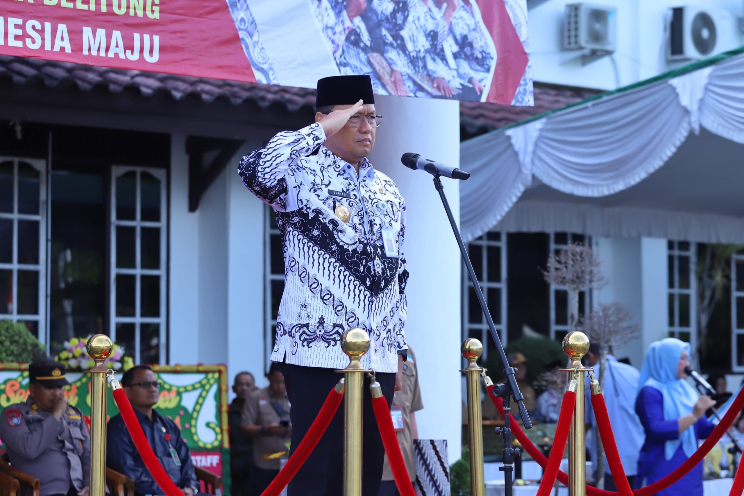 Sungailiat – Pj Gubernur Provinsi Kepulauan Bangka Belitung, Sugito, S.Sos, M.H memimpin Upacara Peringatan Hari Guru Nasional (HGN) 2024 dan Hari Ulang Tahun (HUT) Persatuan Guru Republik Indonesia (PGRI) ke-79 dengan penuh khidmat dan antusiasme, Senin (25/11/2024),
