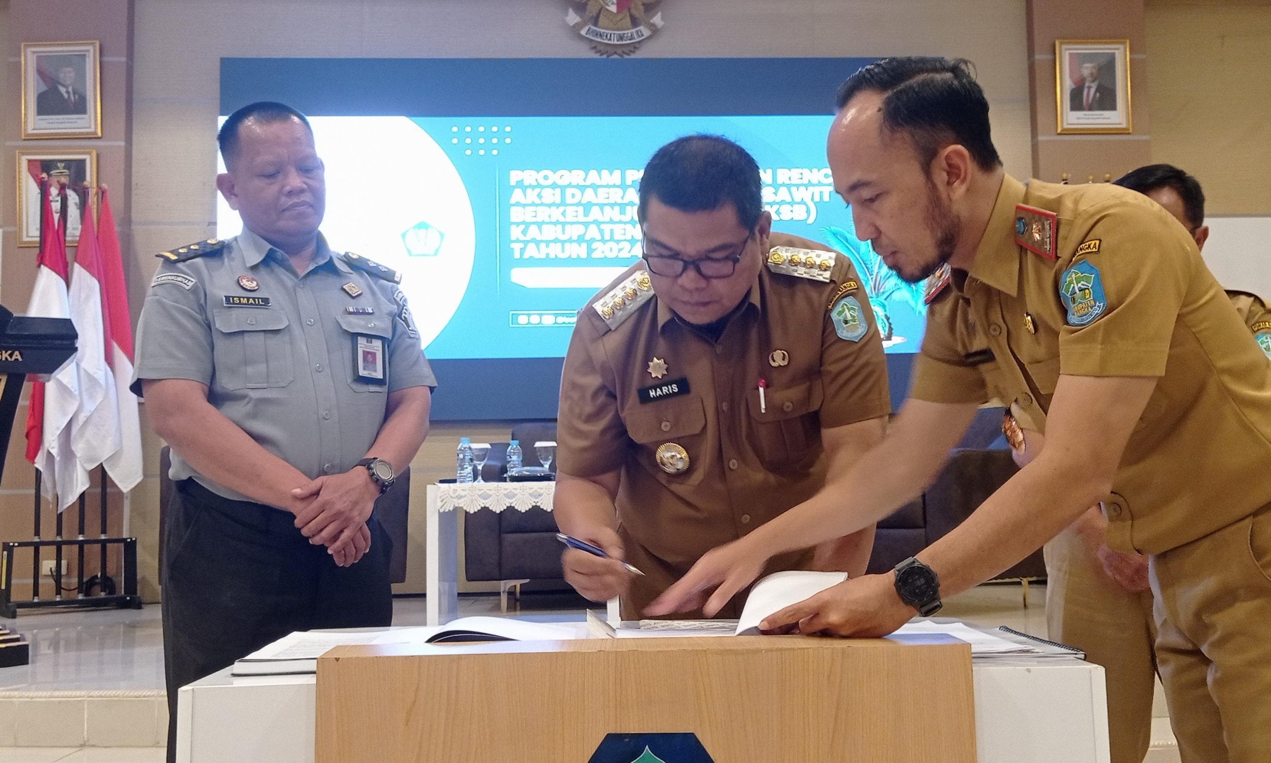 Acara kemudian dilanjutkan dengan penandatanganan RAD-KSB oleh Pj. Bupati Bangka didampingi segenap tamu undangan lainnya.