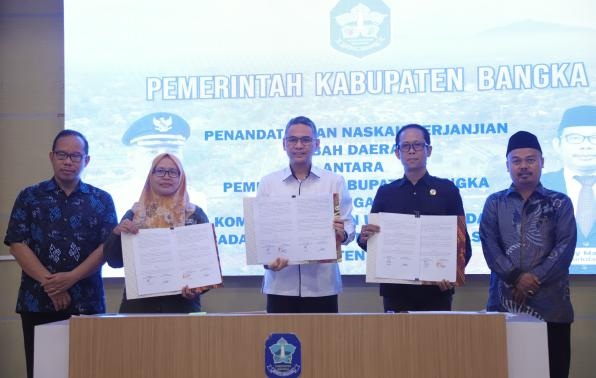 Penandatanganan NHPD antara Pemkab Bangka dengan KPU dan BAWASLU, Jumat (21/02/2025) di OR Parai Tenggiri Kantor Bupati Bangka.