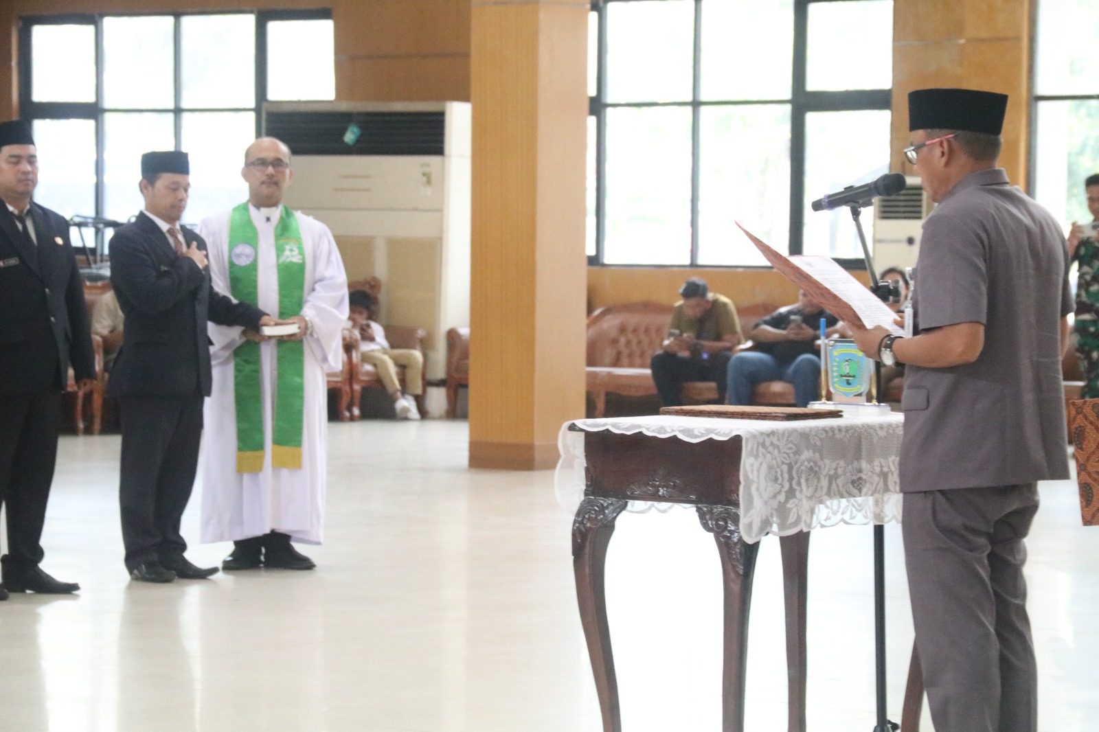 Tanjungpandan, Media Center – Bupati Belitung, Djoni Alamsyah melakukan mutasi sejumlah pejabat eselon 2 dan Direktur RSUD Marsidi Judono, Jumat (22/8/2025. Pelaksaan pengambilan sumpah jabatan dilaksanakan di Gedung Ishak Zainudin.